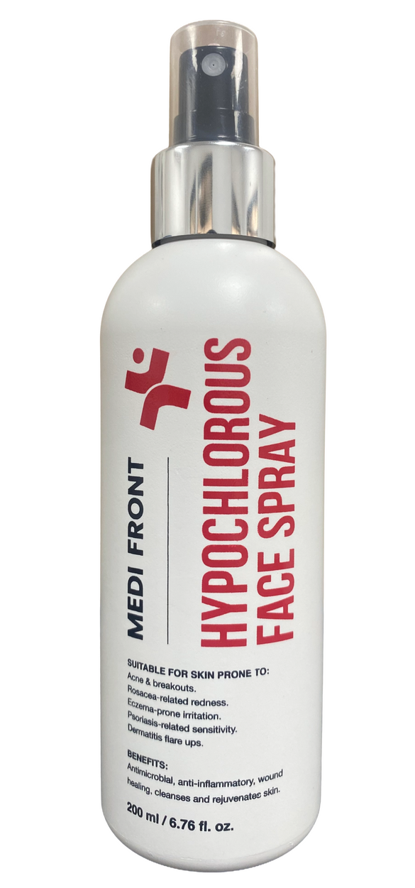 Electrolyzed Purified (RO) Water — carrierNothing more. Nothing less.Environment & QualityProduced under cosmetic-grade hygiene standards, Medifront Hypochlorous Skin Spray is fully biodegradable and eco-friendly.Bottles are made from recyclable materials.Contact & SupportManufactured for Medifront by: